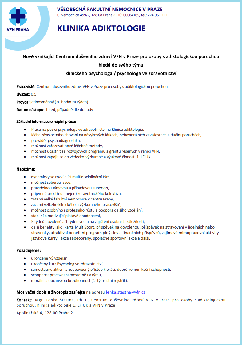 Centrum duševního zdraví VFN v Praze hledá klinického psychologa pro adiktologii